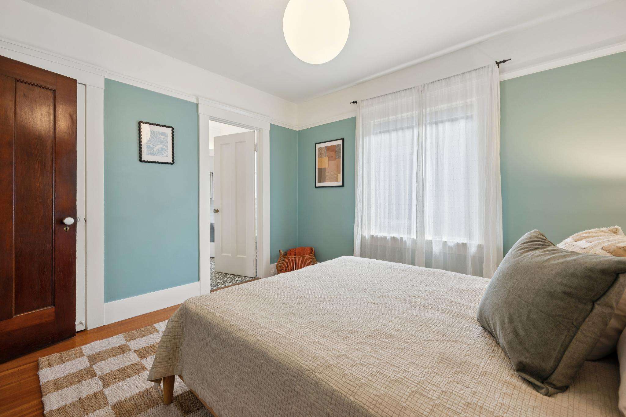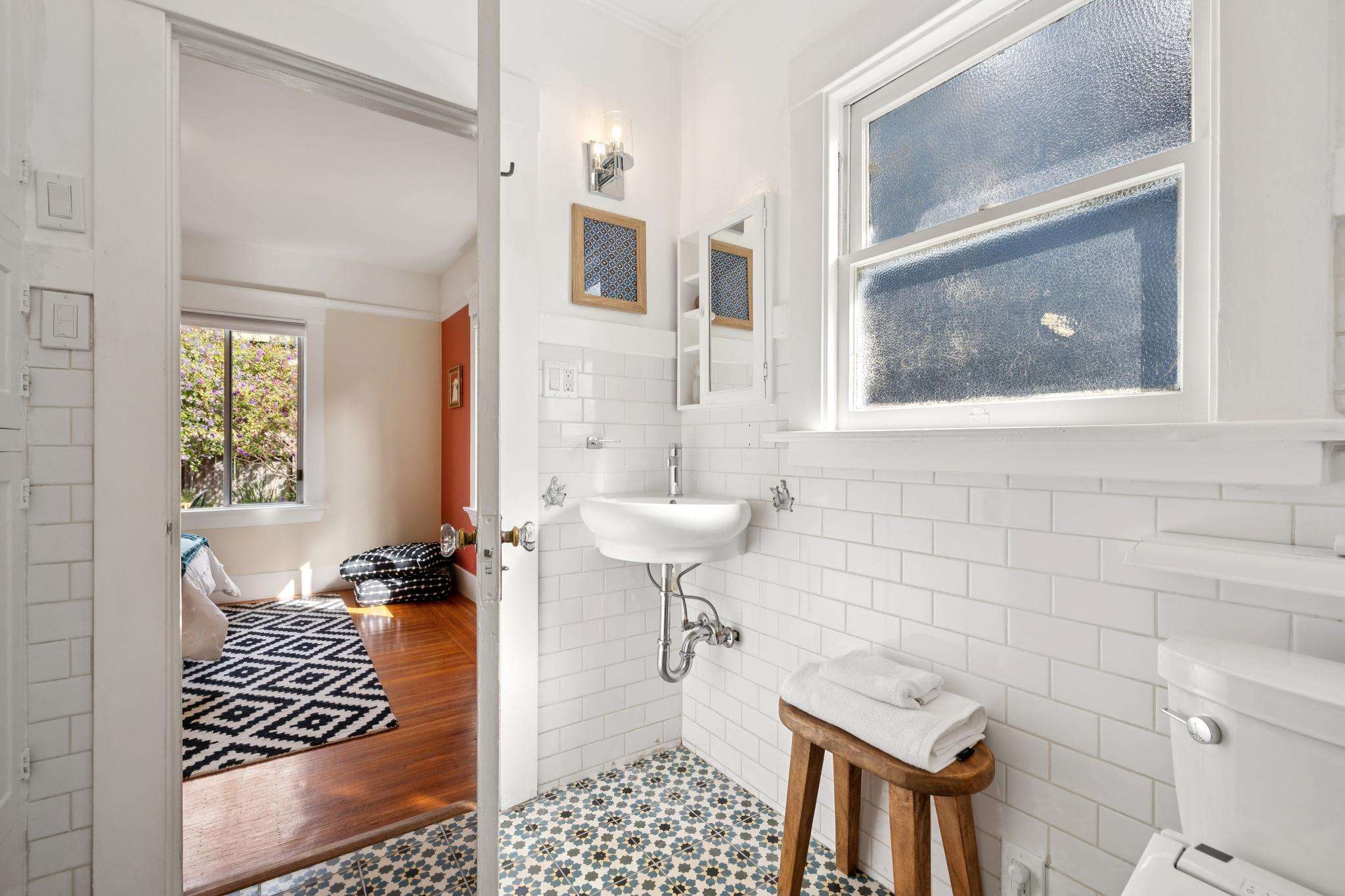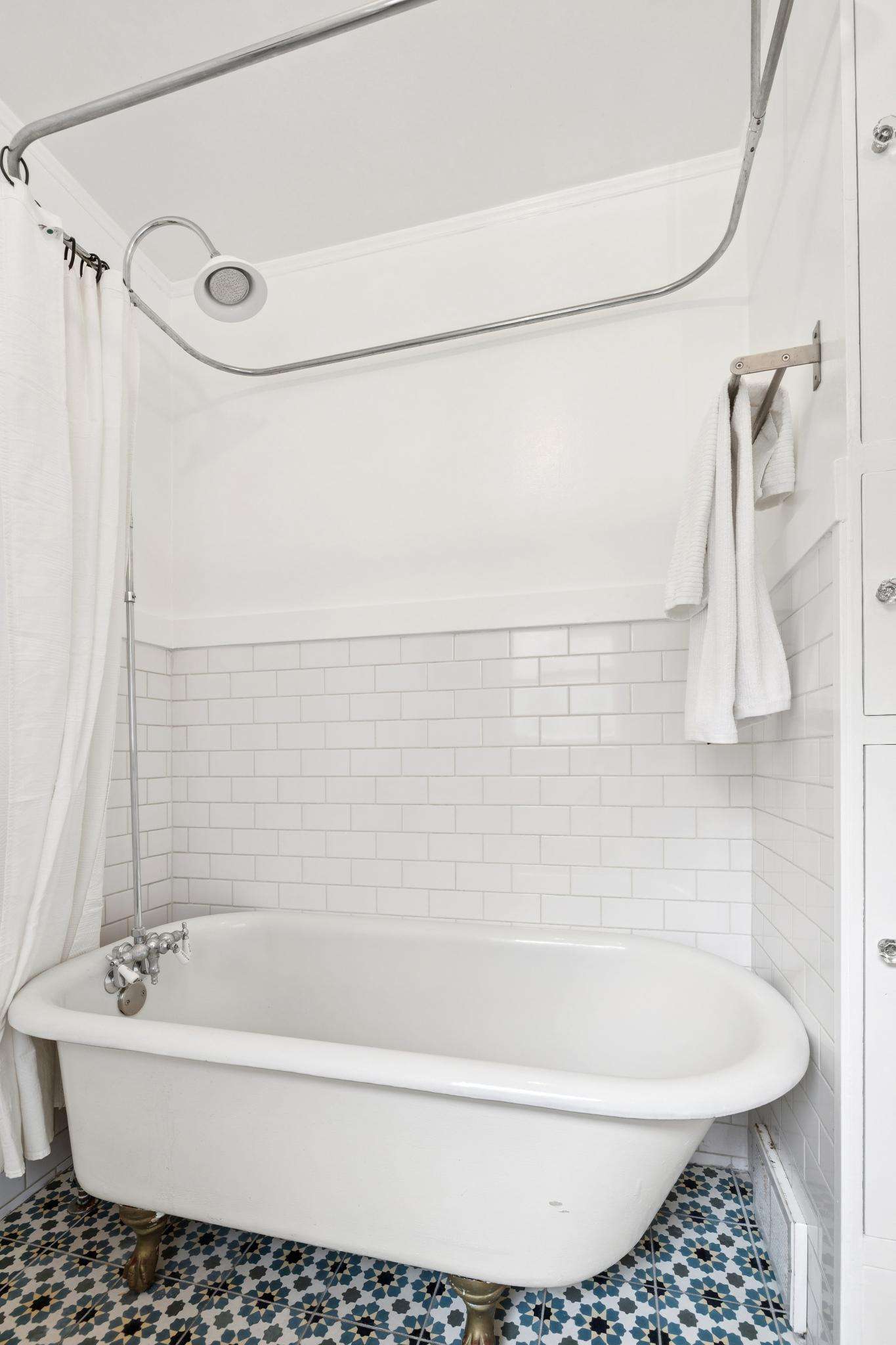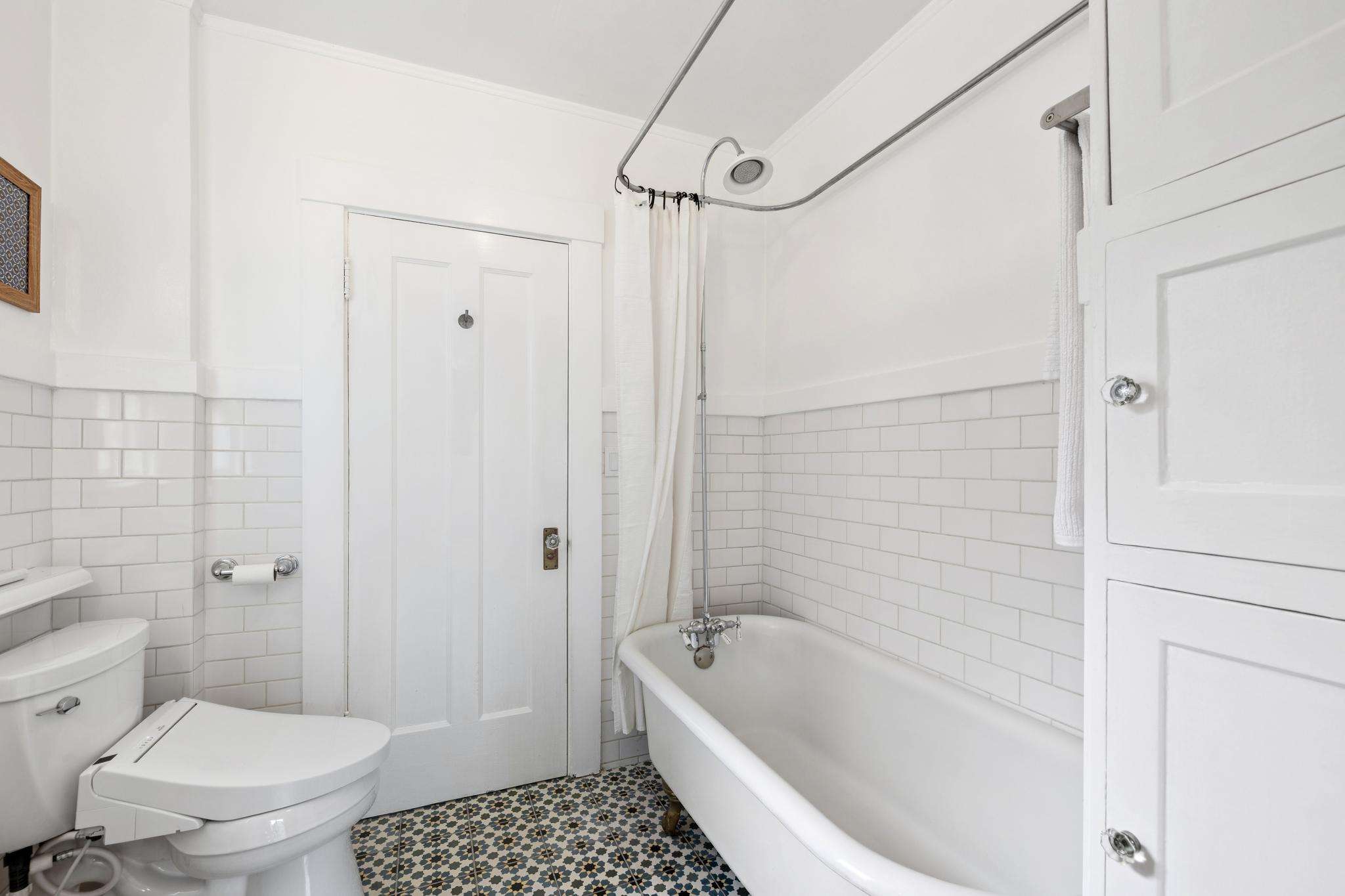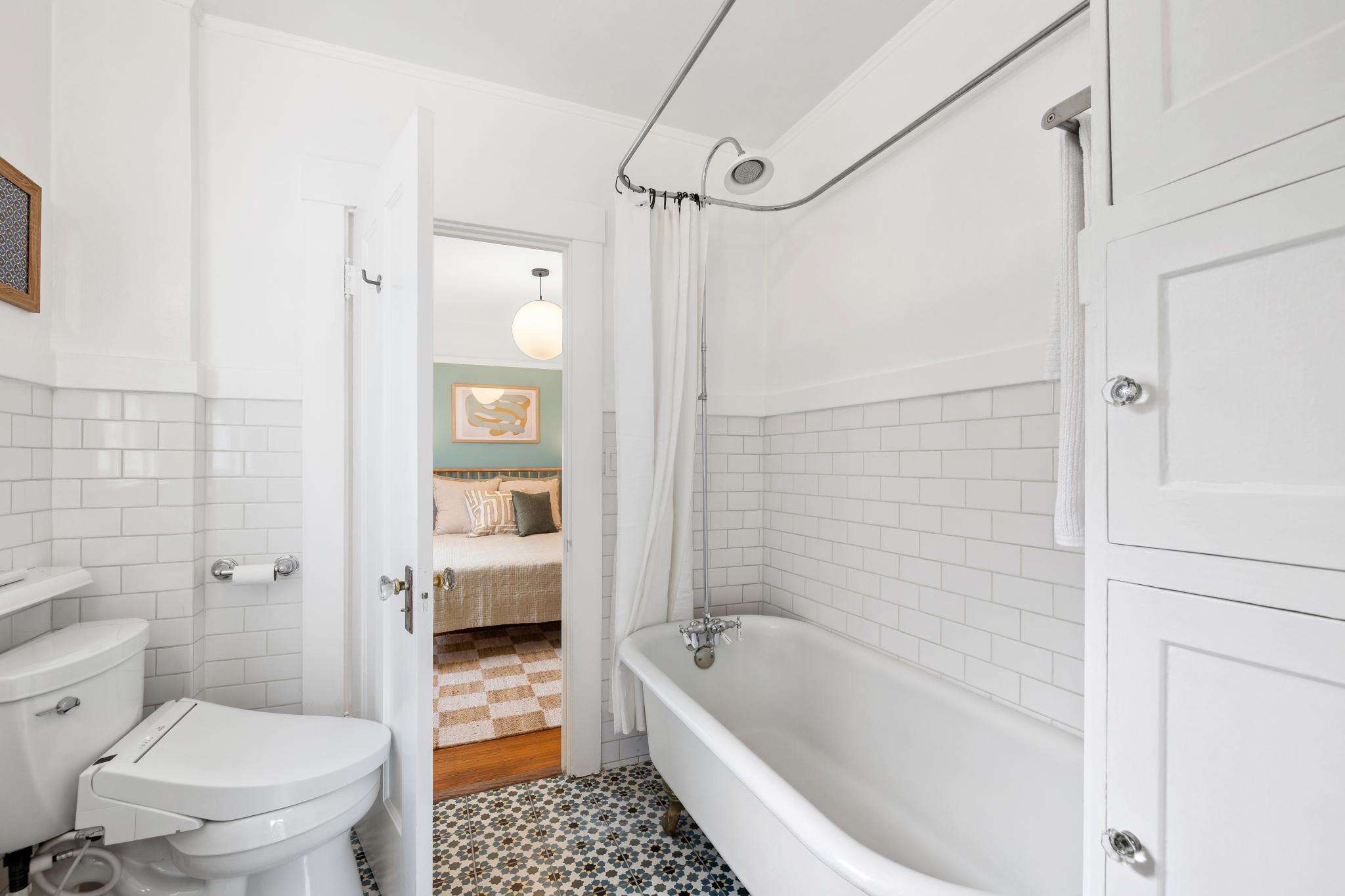 Two bright bedrooms boast deep closets and share access to the bathroom, with vintage detailing. The stylish tile flooring and bidet balance the classic charm of a clawfoot tub, surround walls with subway tile, and recessed linen cubbies with glass knobs.