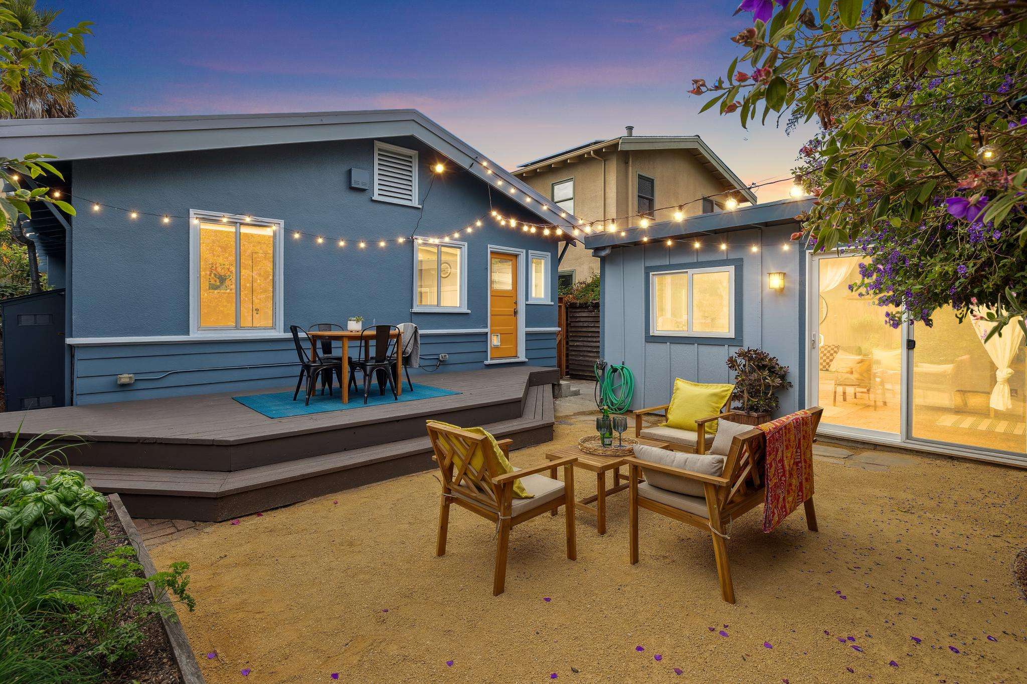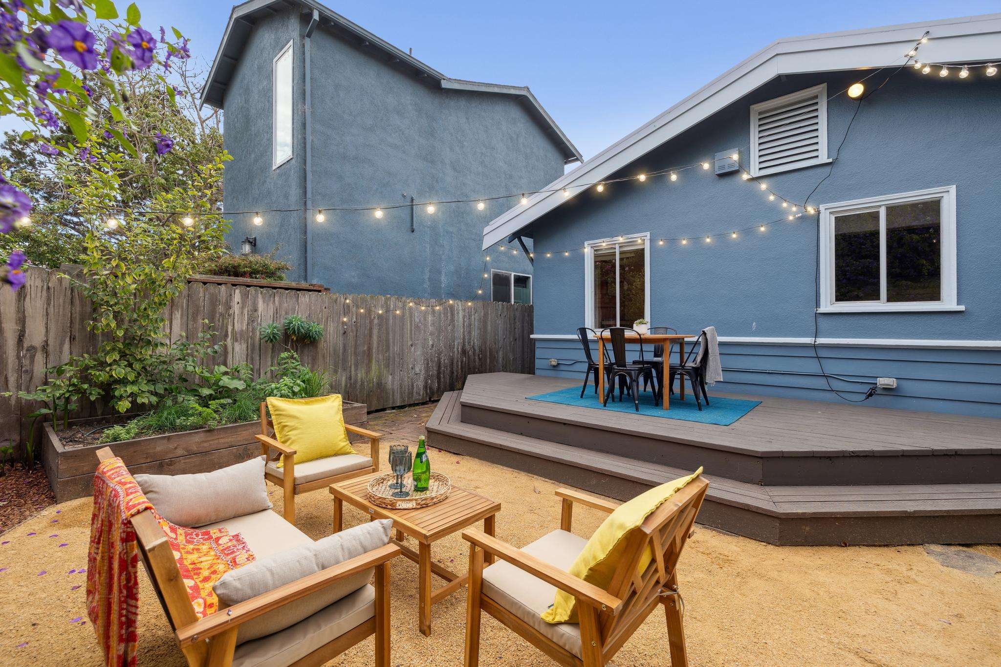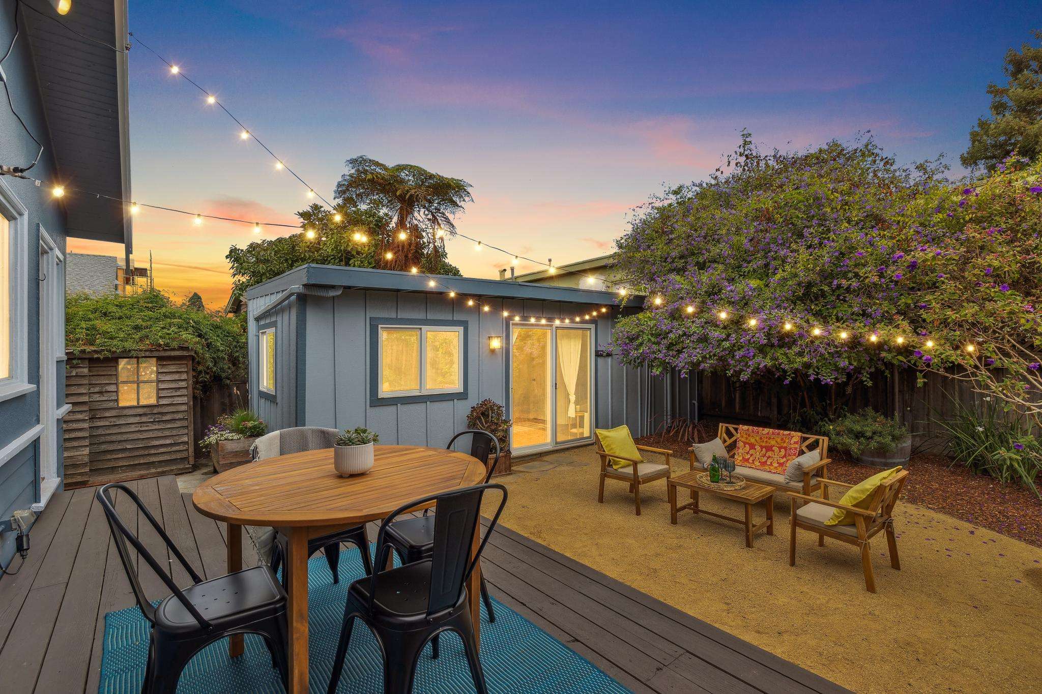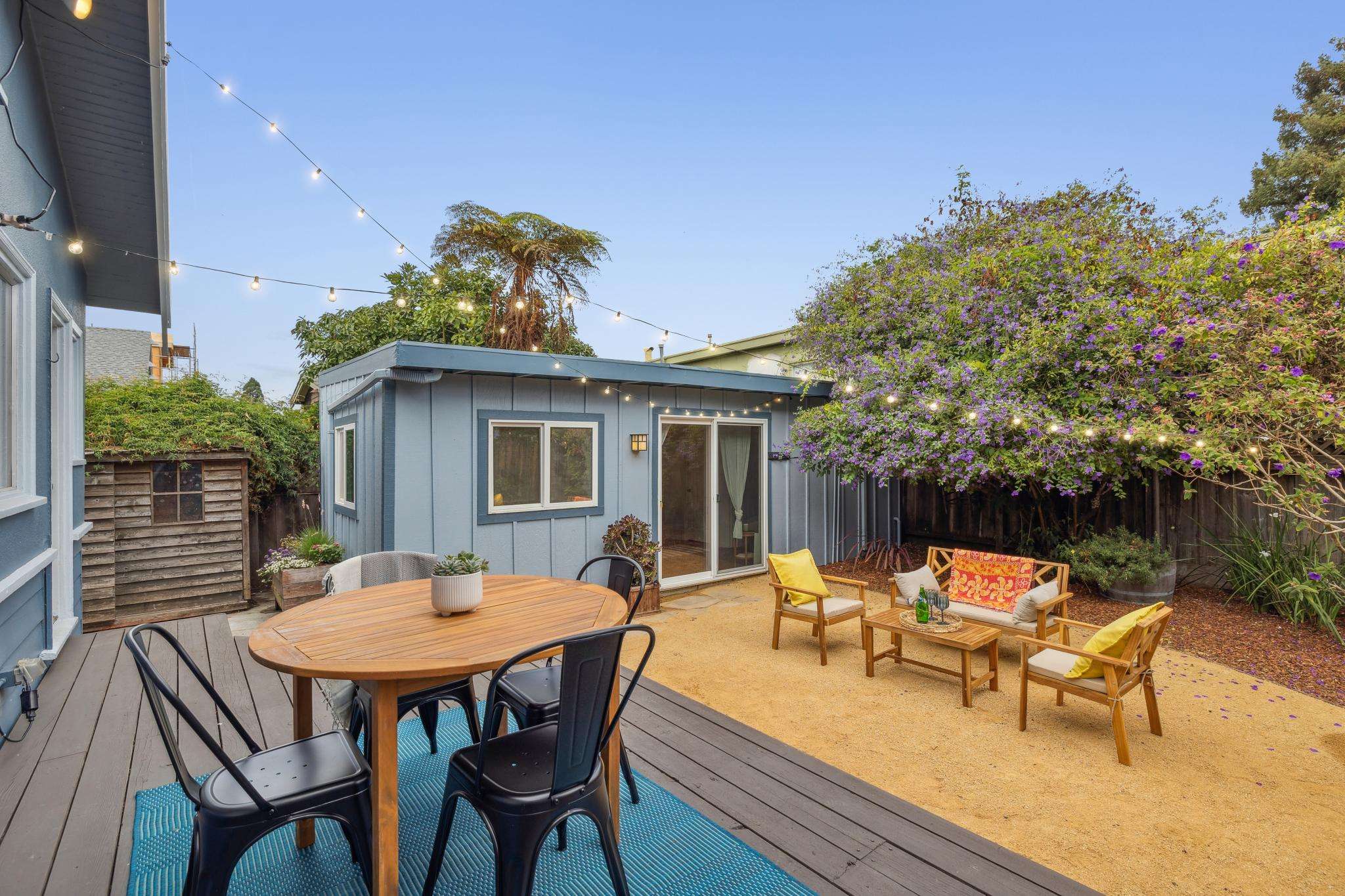 Step through the laundry room off the kitchen to access the backyard. A spacious deck spans the full width of the house, offering plenty of room for al fresco dining. The private yard is beautifully landscaped with raised beds for herbs, flowers, and vegetables, two mature purple-flowering trees, and bistro lights that create a warm, inviting ambiance. Best of all is a detached finished studio with glass doors, a skylight, wood floors, a large walk-in closet, and a full bathroom—an ideal guest retreat, creative workspace, or potential ADU. A rustic shed completes the backyard, adding both charm and utility.