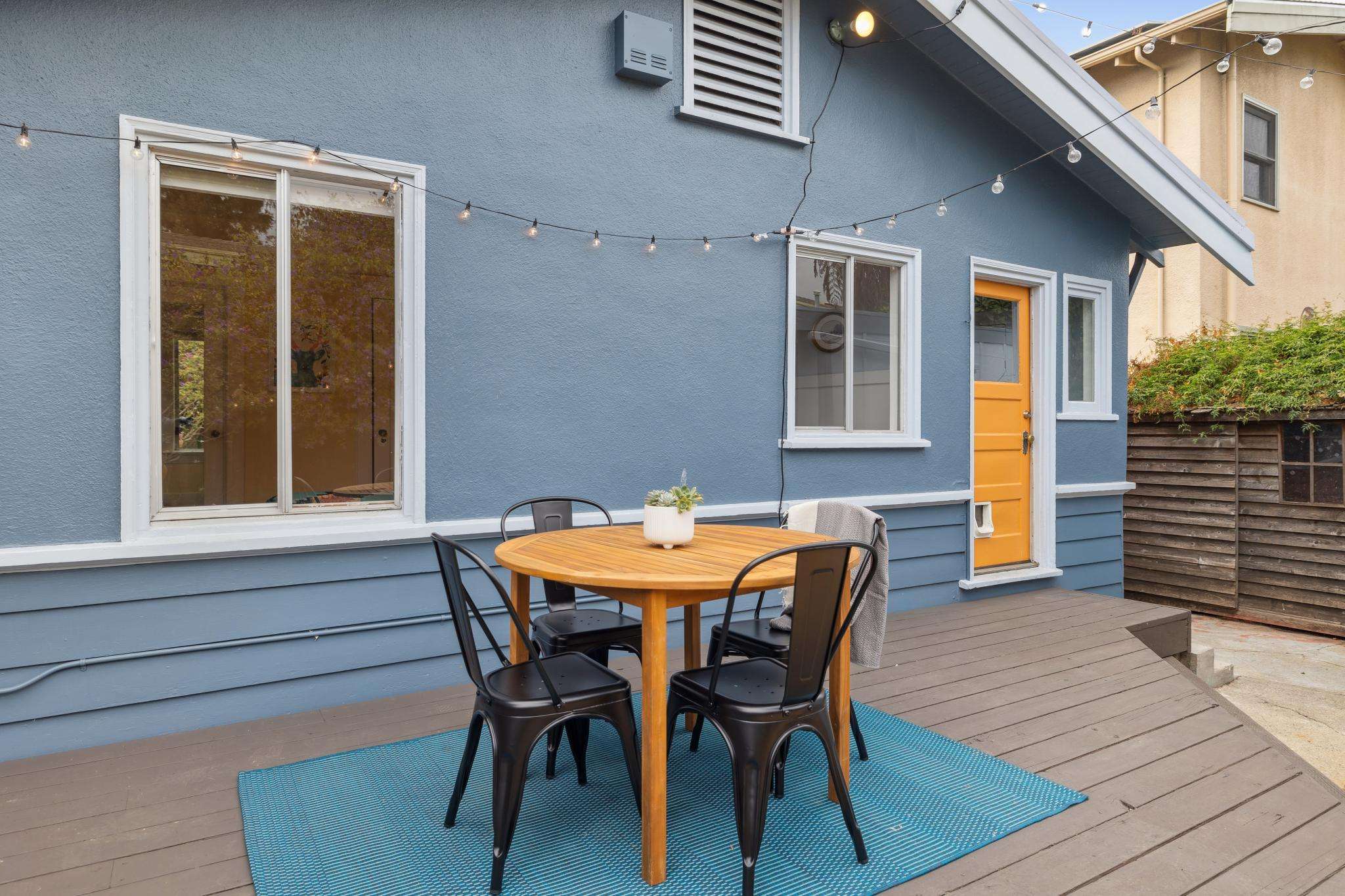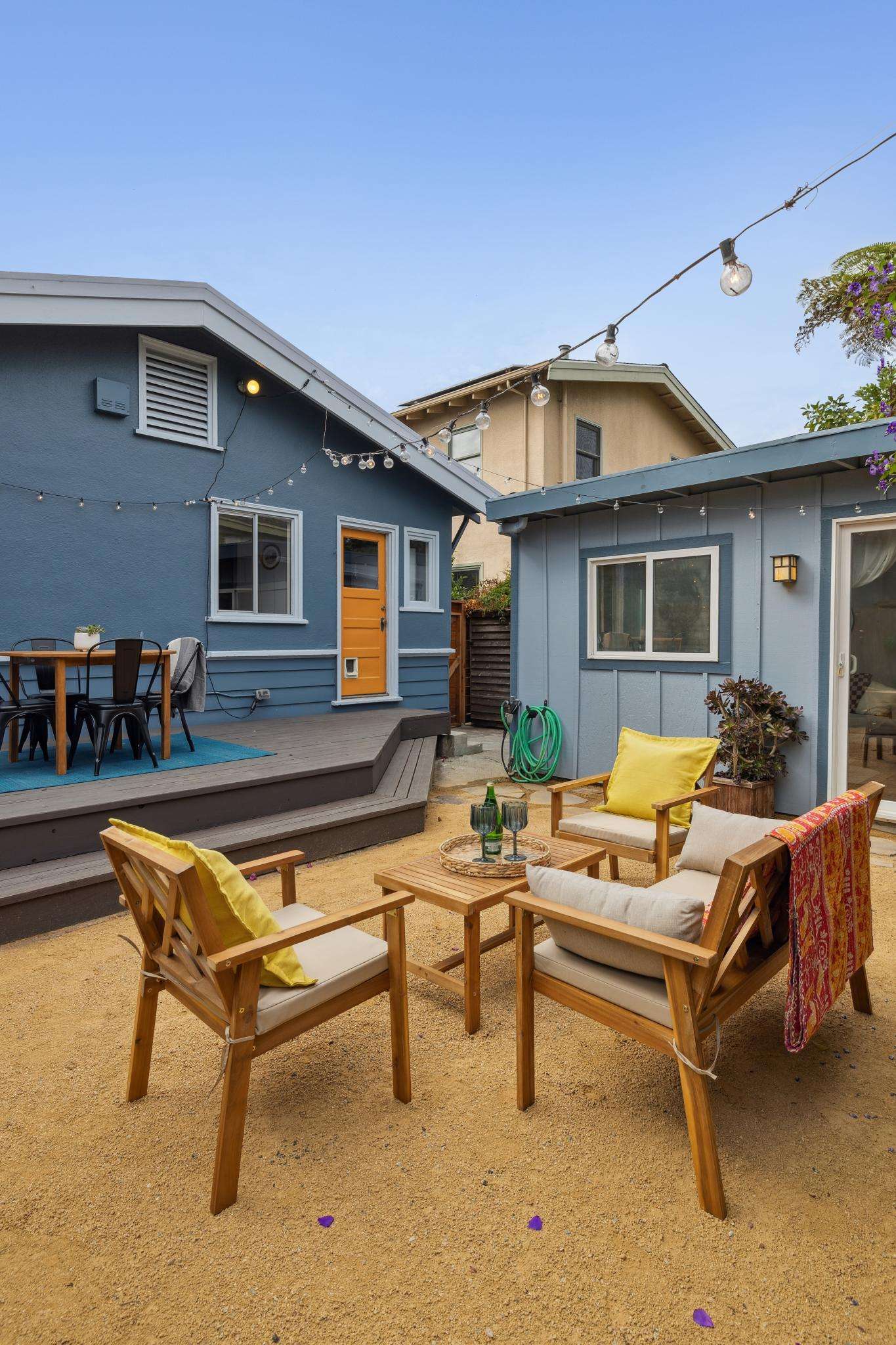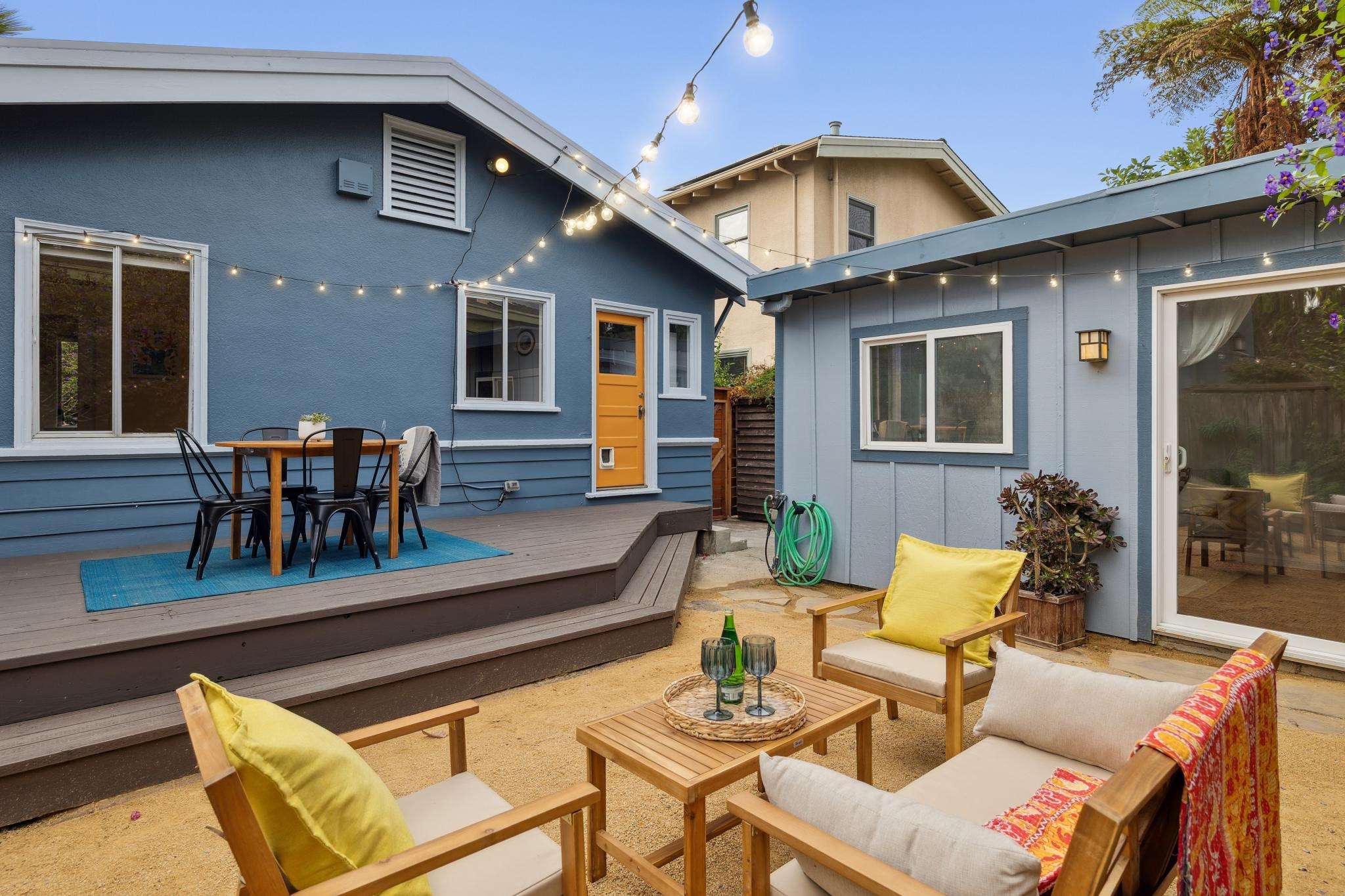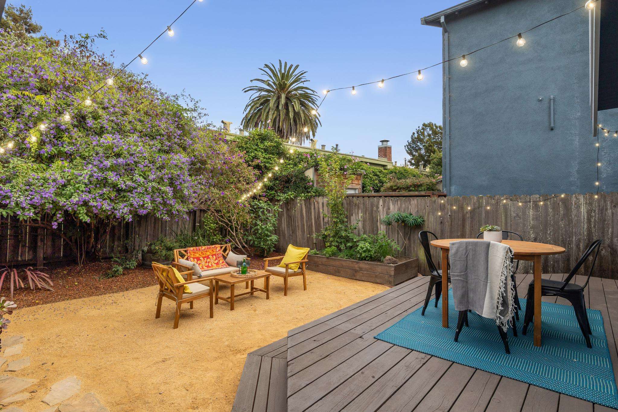 Step through the laundry room off the kitchen to access the backyard. A spacious deck spans the full width of the house, offering plenty of room for al fresco dining. The private yard is beautifully landscaped with raised beds for herbs, flowers, and vegetables, two mature purple-flowering trees, and bistro lights that create a warm, inviting ambiance. Best of all is a detached finished studio with glass doors, a skylight, wood floors, a large walk-in closet, and a full bathroom—an ideal guest retreat, creative workspace, or potential ADU. A rustic shed completes the backyard, adding both charm and utility.