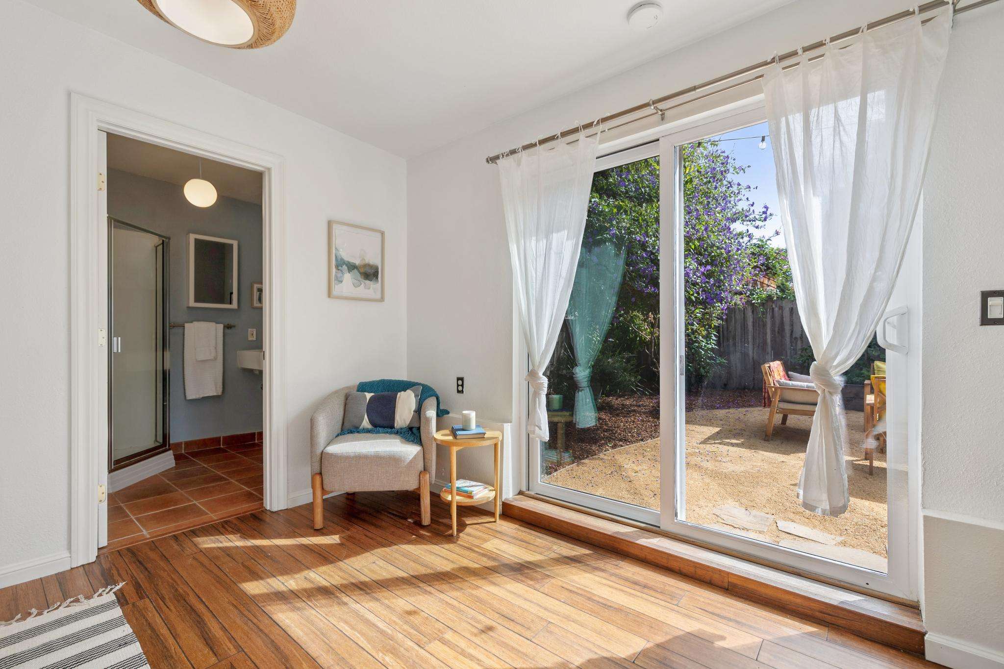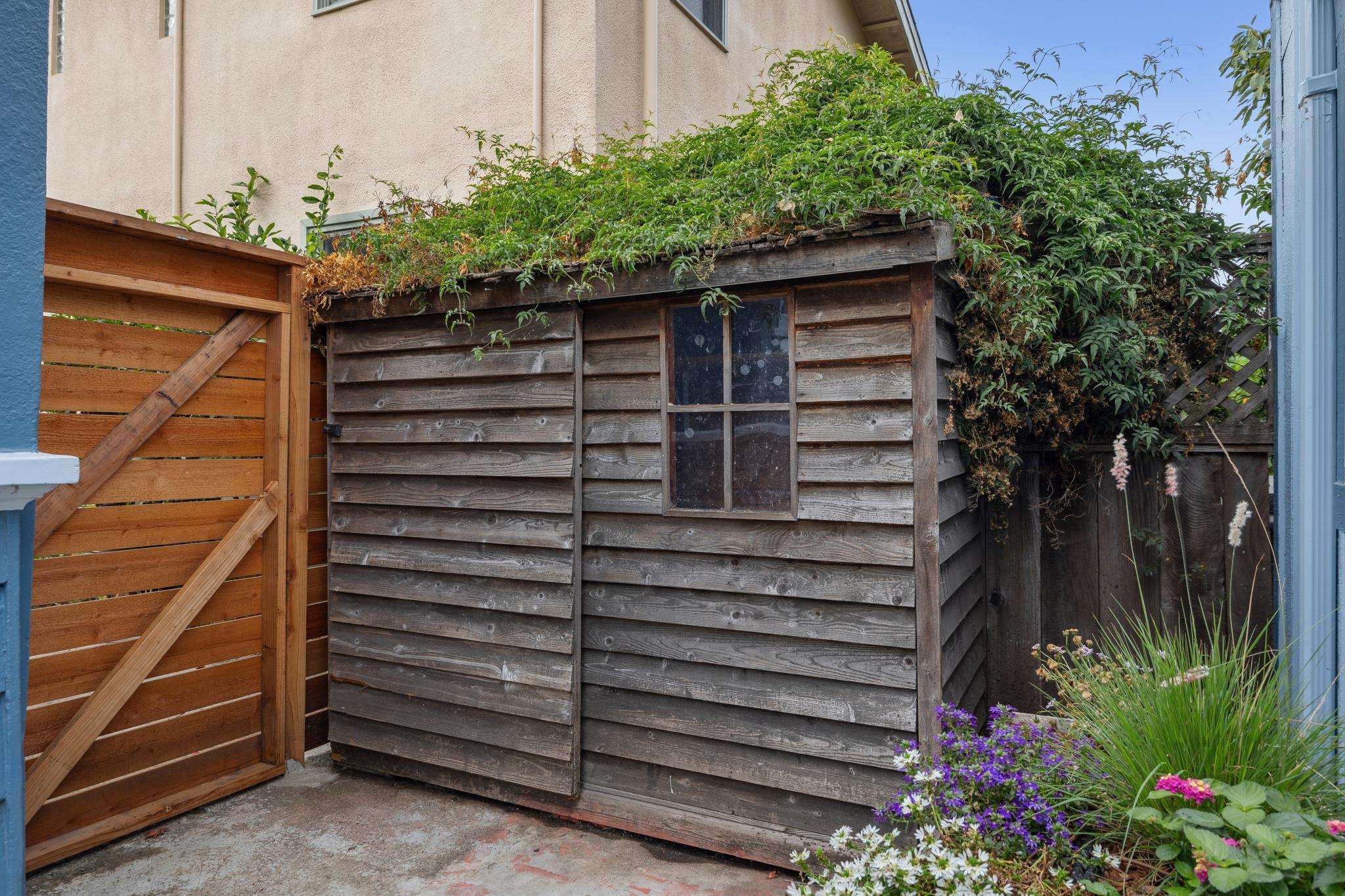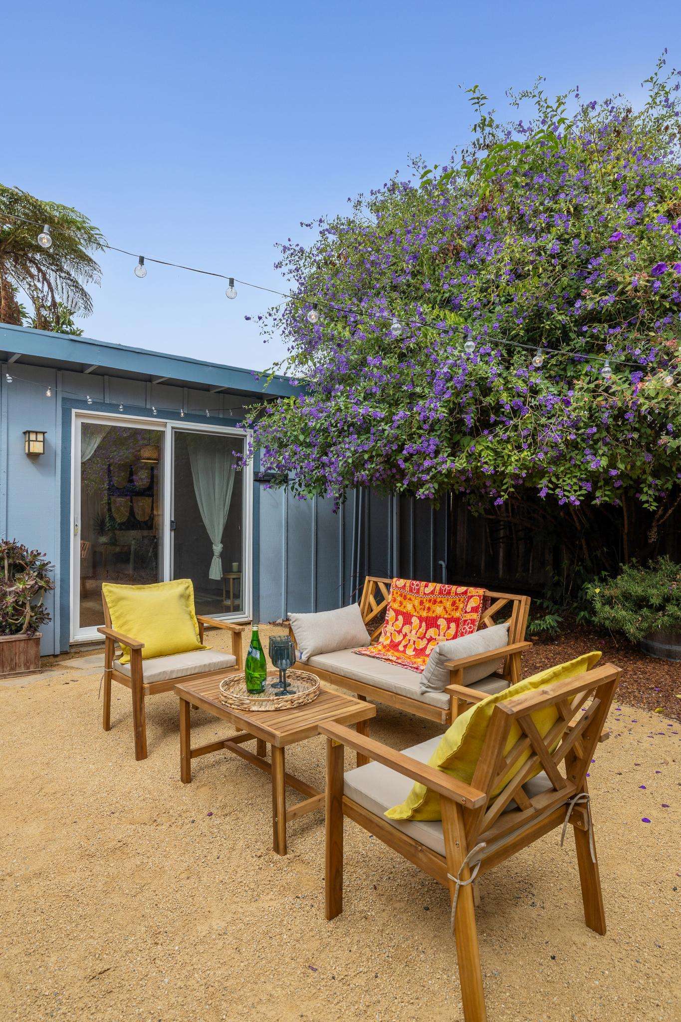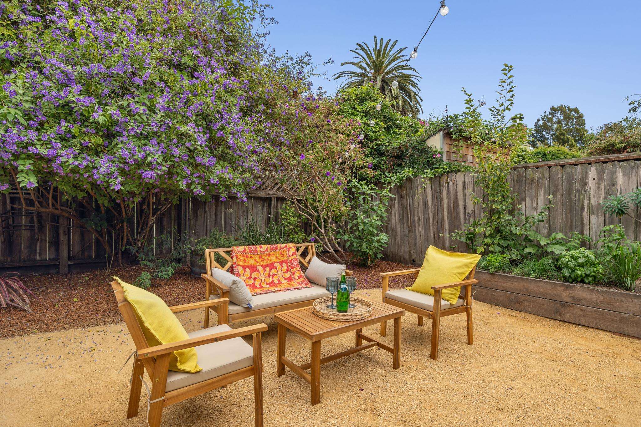 Step through the laundry room off the kitchen to access the backyard. A spacious deck spans the full width of the house, offering plenty of room for al fresco dining. The private yard is beautifully landscaped with raised beds for herbs, flowers, and vegetables, two mature purple-flowering trees, and bistro lights that create a warm, inviting ambiance. Best of all is a detached finished studio with glass doors, a skylight, wood floors, a large walk-in closet, and a full bathroom—an ideal guest retreat, creative workspace, or potential ADU. A rustic shed completes the backyard, adding both charm and utility.
