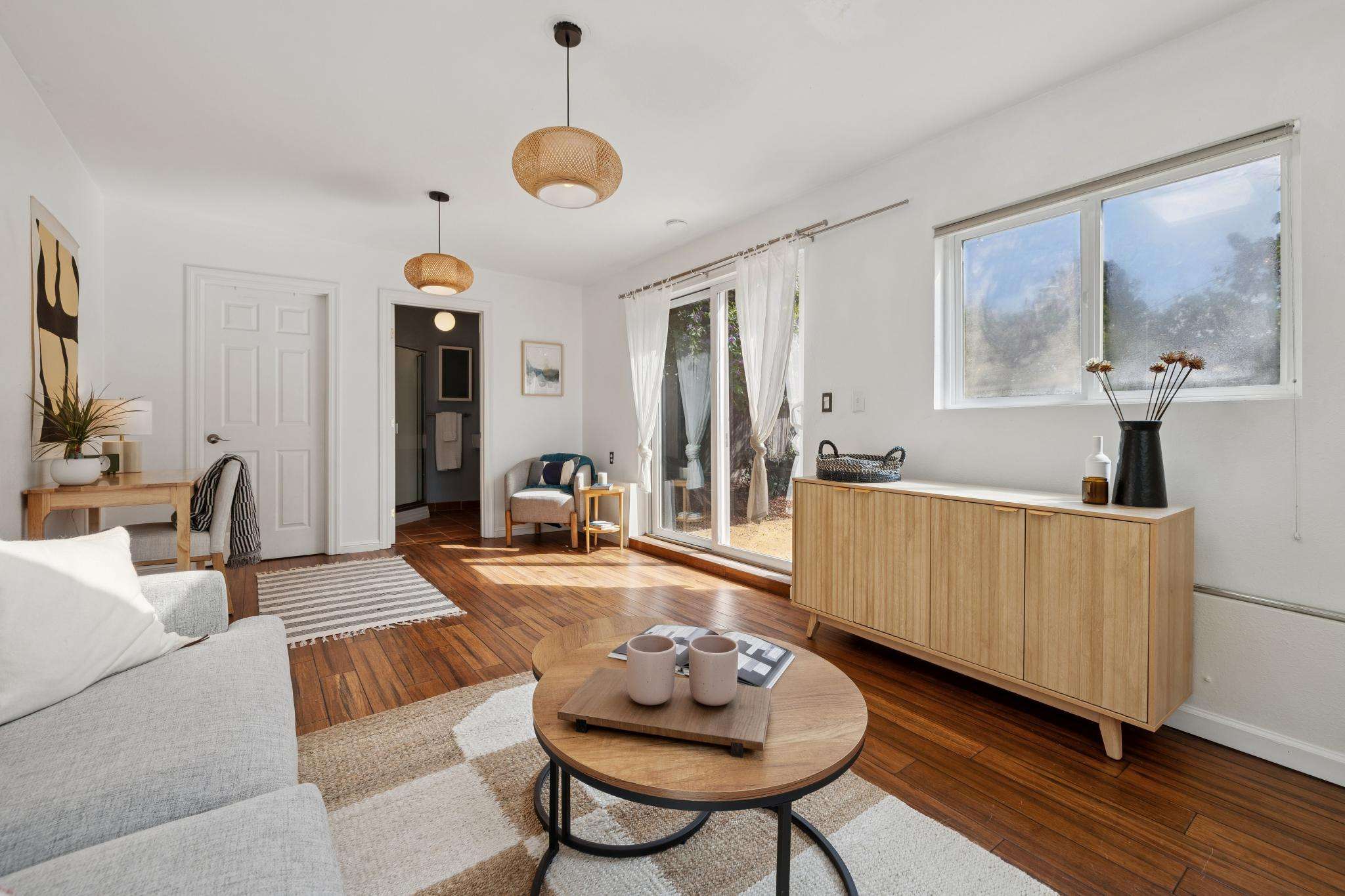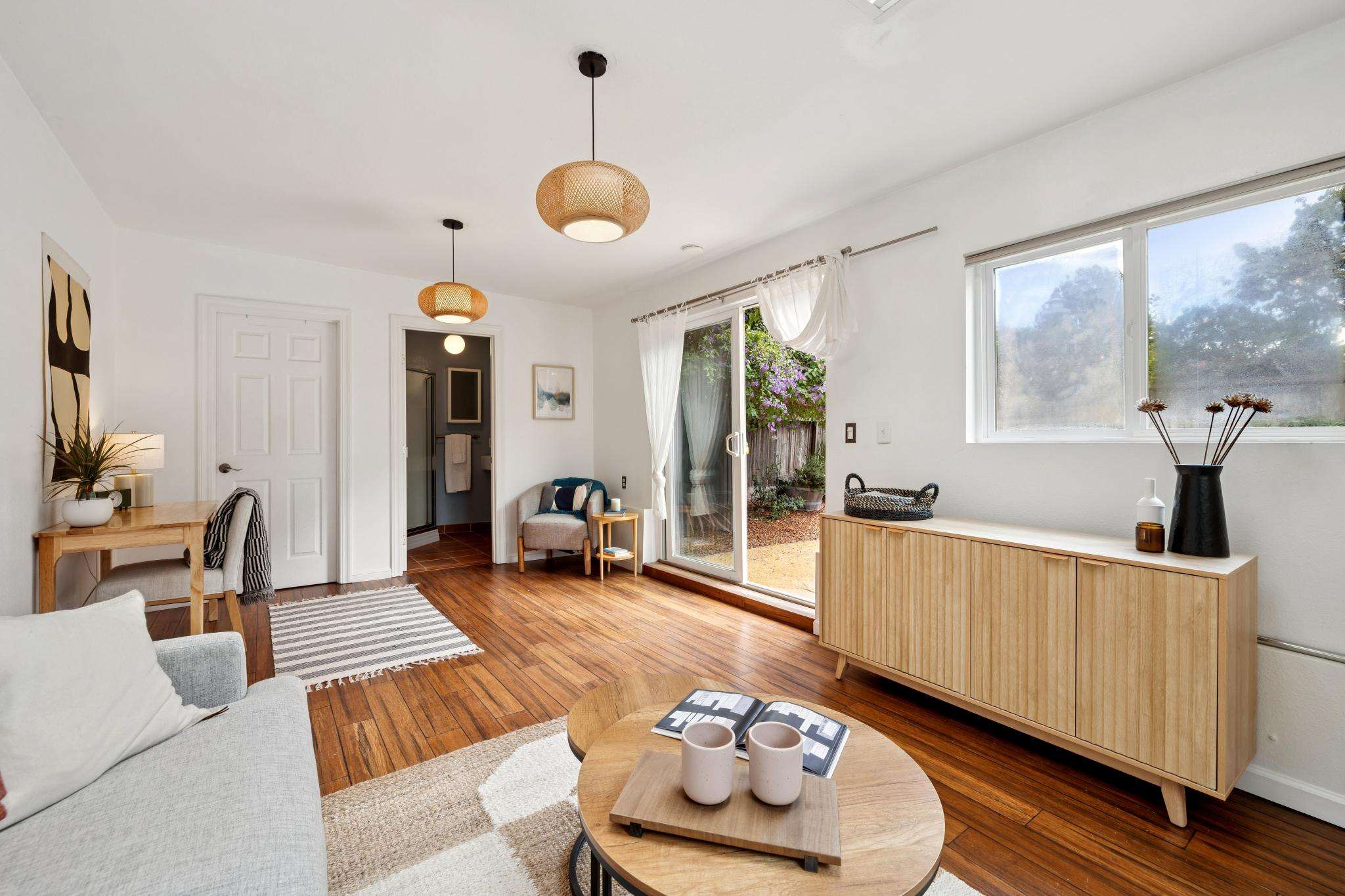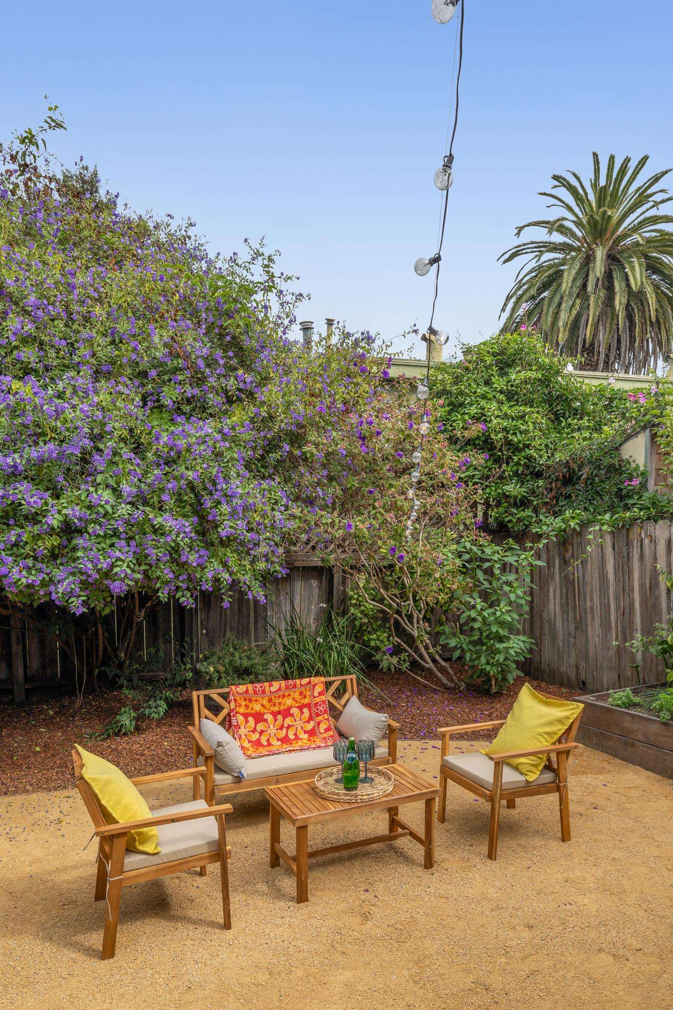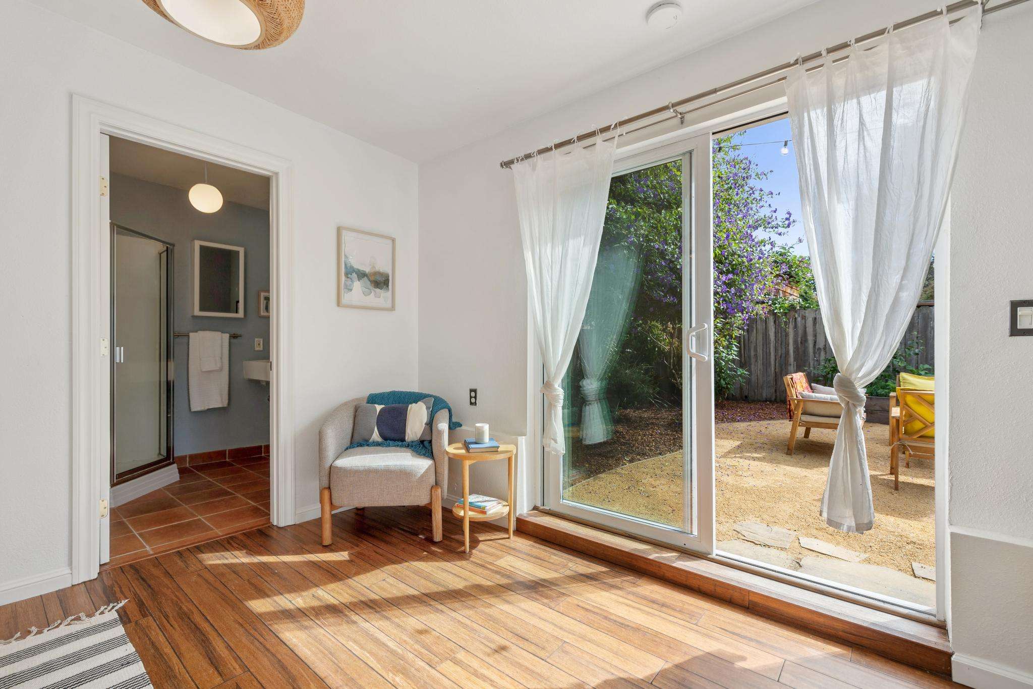 Step through the laundry room off the kitchen to access the backyard. A spacious deck spans the full width of the house, offering plenty of room for al fresco dining. The private yard is beautifully landscaped with raised beds for herbs, flowers, and vegetables, two mature purple-flowering trees, and bistro lights that create a warm, inviting ambiance. Best of all is a detached finished studio with glass doors, a skylight, wood floors, a large walk-in closet, and a full bathroom—an ideal guest retreat, creative workspace, or potential ADU. A rustic shed completes the backyard, adding both charm and utility.